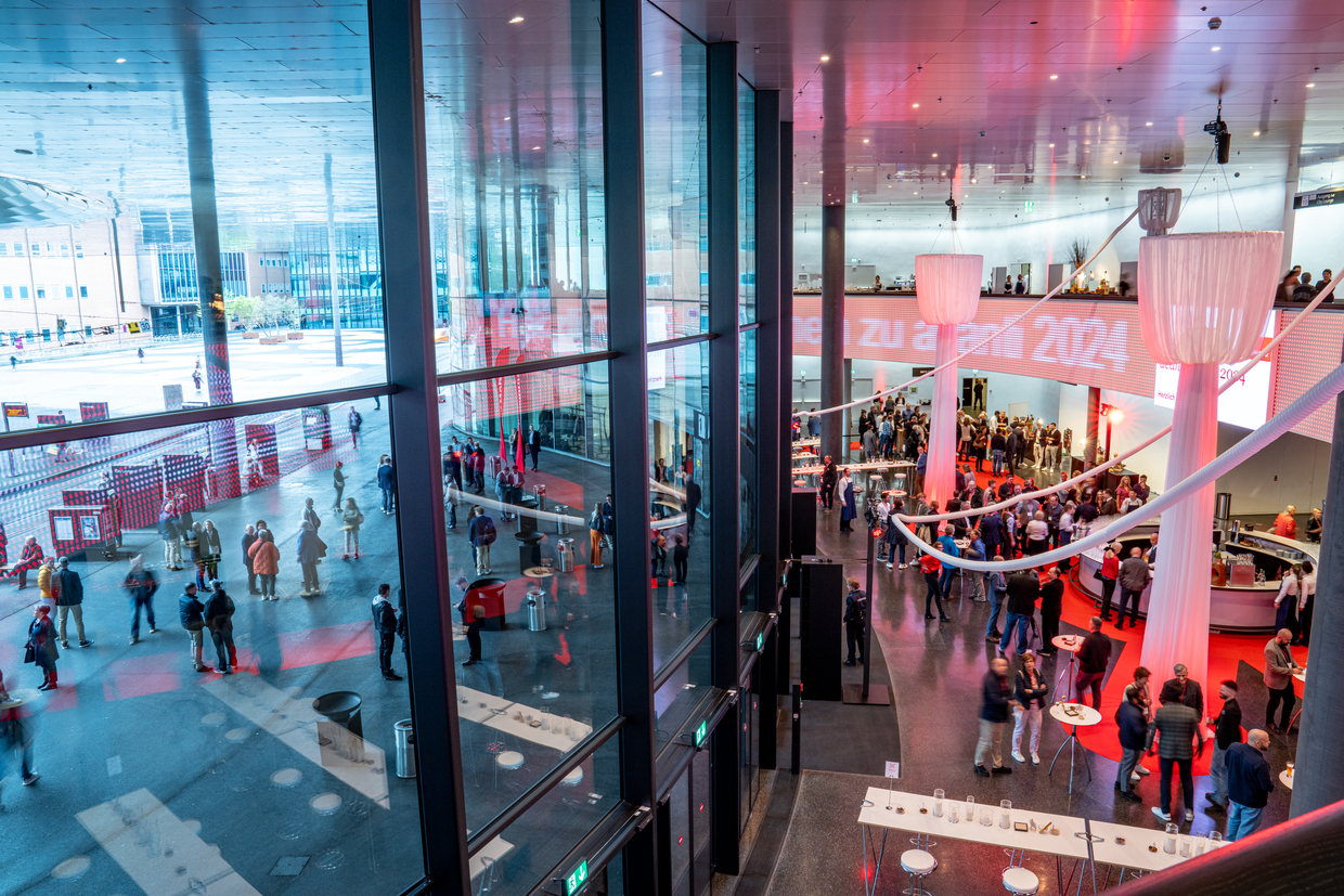 Mit ihrem vorgelagerten Platz City Lounge, setzt die Halle bereits vor dem Eintritt einen markanten Akzent. Im Inneren prägt die Architektur eine klare und urbane Atmosphäre.